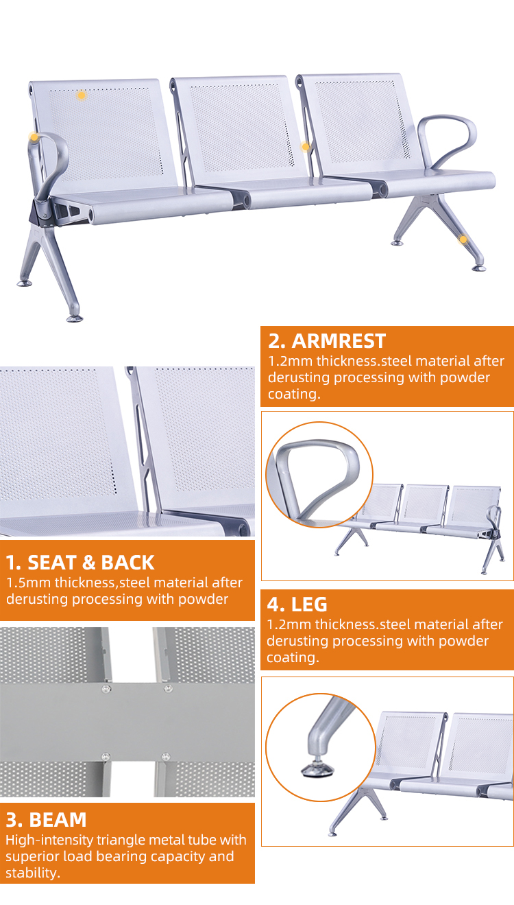 Are you tired of standing in long lines or sitting on uncomfortable airport benches? Look no further! The 3 seater airport chair is here to provide you with a comfortable and convenient seating option for airports, train stations, and other transportation hubs. With its durable steel frame, this chair will keep you comfortable and relaxed during your travels. Plus, its ability to accommodate up to three people makes it a perfect choice for traveling with friends or family. So why wait? Upgrade your travel experience with the 3 seater airport chair today!